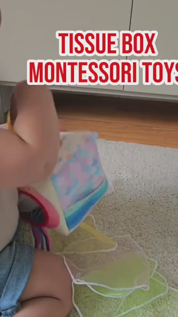 This Montessori-inspired baby tissue box toy offers safe, screen-free sensory play for infants 6 months and up. Designed to captivate little hands and curious minds, it includes vibrant scarves and crinkly textures that encourage exploration and developmental growth.