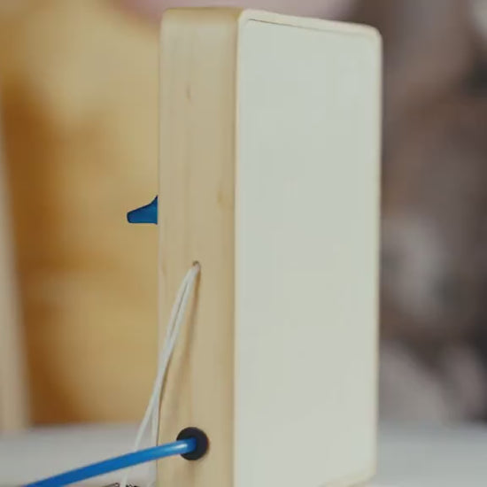 Includes 1 wooden busy board with multiple light switches, LED bulbs, buttons, gears, and toggles. Powered by 2 AA batteries (not included). Crafted from smooth, sanded wood and BPA-free components.